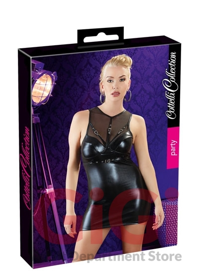 Tight-fitting mini dress in a trendy wet look with a transparent powernet insert above the elaborate cups. There are three decorative straps with buckles in the cleavage area. Below the cups is another decorative strap with a buckle. Wet look 92% polyester, 8% spandex; powernet 90% polyamide, 10% spandex.