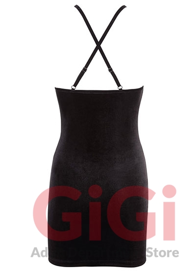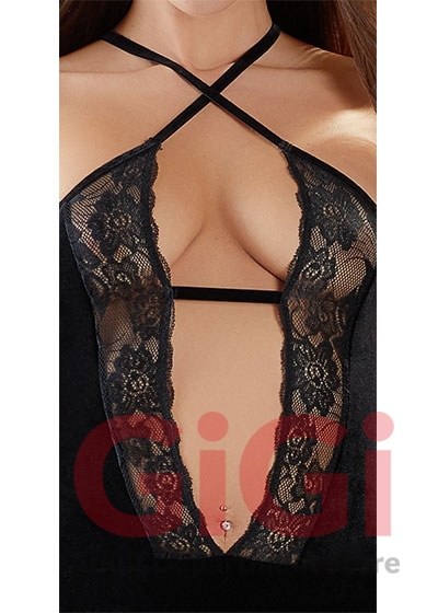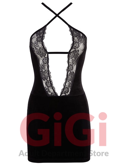 Tight-fitting and figure-flattering mini dress with an very low-cut neckline that is made out of lace. With adjustable criss-cross straps at the front and back. Velvet 90% polyester, 10% spandex; lace 90% polyamide, 10% spandex.