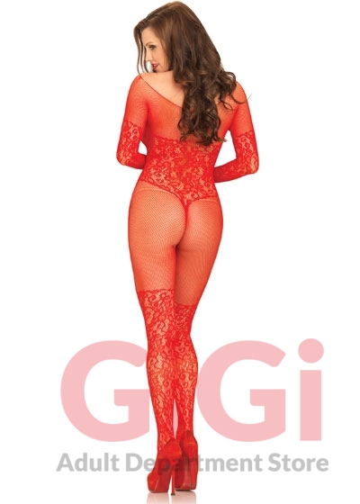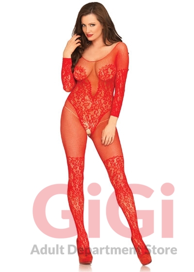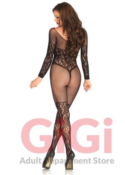 You'll be sexy from head to toe in this gorgeous long sleeved net bodystocking featuring vine lace illusion teddy and thigh high detail.