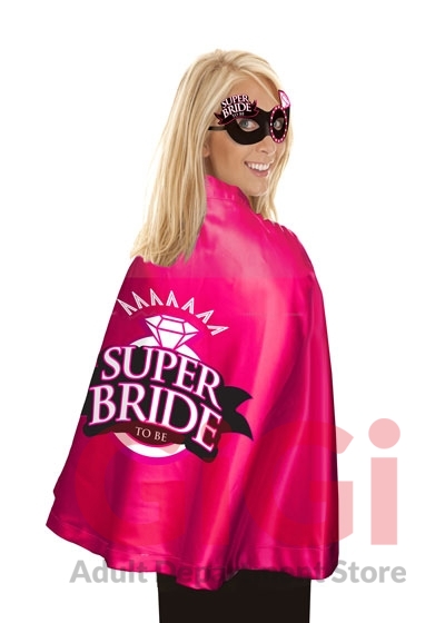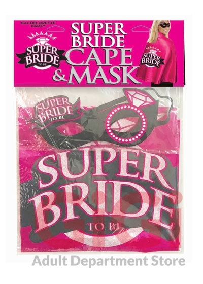 Bachelorette Party Super Bride Cape and Mask Set from Little Genie Productions. Super Bride cape and matching mask comes in a bright pink color with black accents. Cape ties in the front. Mask features Super Bride over on eye and a diamond ring on the other. One size fits most.