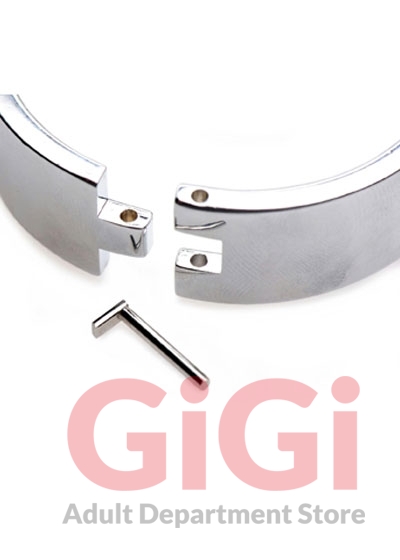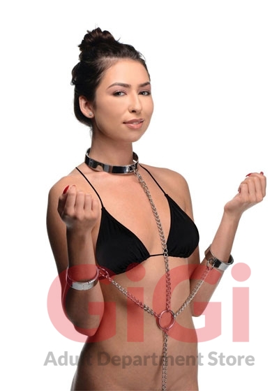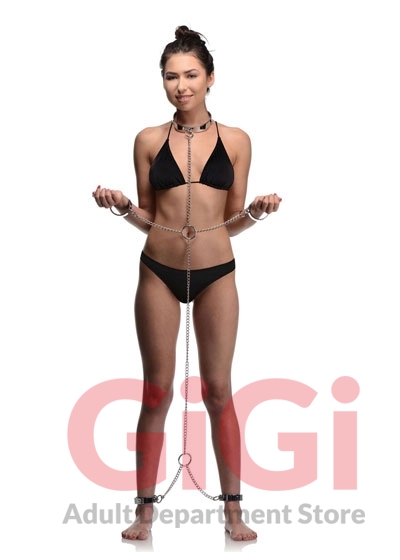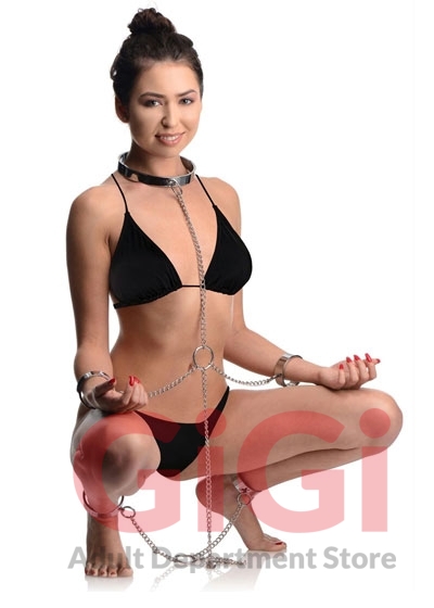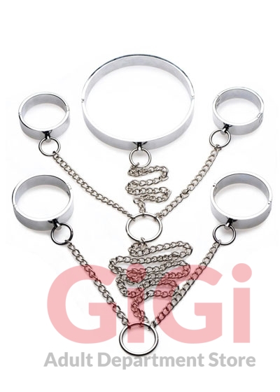 This beautiful stainless steel manacle set will limit your slaves mobility and serve as a reminder of your total control. The chrome collar and each elegant cuff feature a pinhole locking mechanism that is invisible while adorning your partner, but easy to unlatch with the key. All five accessories are connected via their o-rings to a series of chains to create a full-body restraint. Keep your slave on their feet or force them on all fours to show off this stunning bondage set.