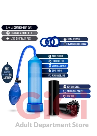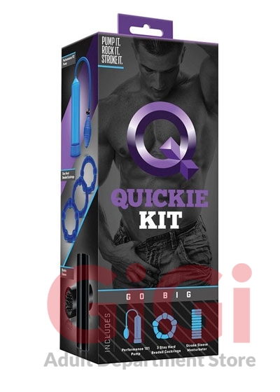 Explore new sensations with the strong suction of the squeeze ball pump, with an 8-inch chamber, flexible silicone tube, and quick release valve ensure maximum comfort. Or work your shaft with the soft, flexible stroke sleeve. Featuring loads of sensation from the ticklers and ribbed walls to engulf your penis, plus it's open-ended for easy clean-up. This Go Big Quickie Kit also includes three beaded cock rings! These flexible rings can be worn separately or all at once and can stretch to fit around the balls too. All products are made of body safe materials for your comfort and safety.