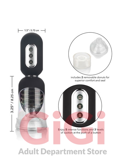 The sleek smart pump has a nubbed chamber to give you stimulating pleasure with or without the pump. It has a special quick air release button for when you want to relax the workout. The penis pump and thick, durable donut sleeve are designed to create the perfect seal and powerful suction at the touch of a button.