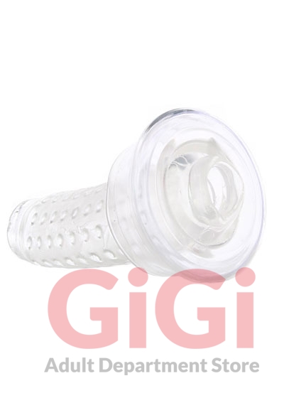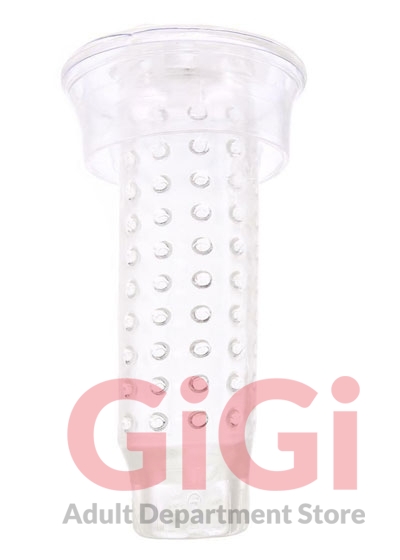 Highly textured inside and showing off an eager mouth outside, this crystal clean sleeve slips into the opening of most standard pump cylinders (up to 4"/10.25cm diameter)for that sturdy outside/soft inside sensation you love. Once past the clingy lips, you'll enter a nice snug chamber lined with vertical rows of massaging nubs. What better way to make use of a newly pumped penis!?