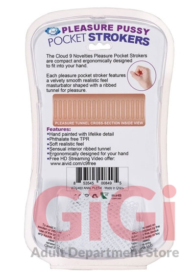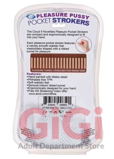 Each Cloud 9 Novelties Pocket Stroker features a velvety smooth realistic feel masturbator shaped with ribbed tunnel for pleasure. The Cloud 9 Novelty strokers are all compact and ergonomically shaped to fit into the palm of your hand. Simply flip the stroker over from end to end to experience a tight pussy or anal experience.