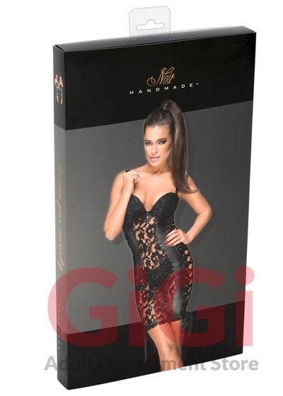 This black mini dress offers cheeky glimpses in all the right areas, thanks to the extravagant strip of transparent lace at the front. The shiny matte wetlook, which is the main material, and the tailored fit puts your curves in the limelight. The full-length lace insert at the front offers breathtaking views of your body and there is a smaller lace insert at the back above the zip as well. The underwired cups with wide straps are also covered in lace too. Another highlight is the full-length satin lacing down either side of the dress that reveals even more of your body and looks extremely erotic!