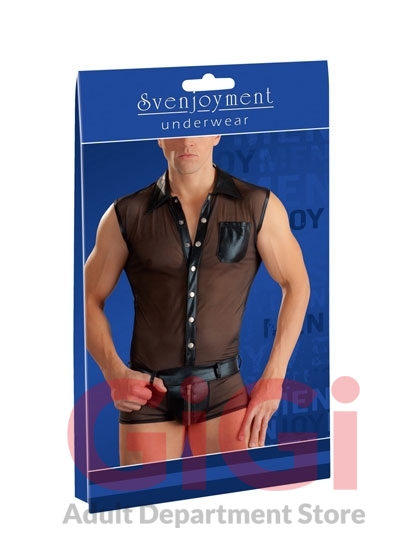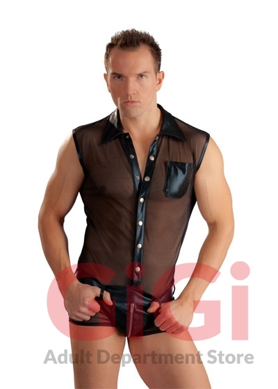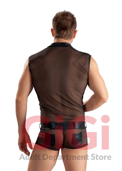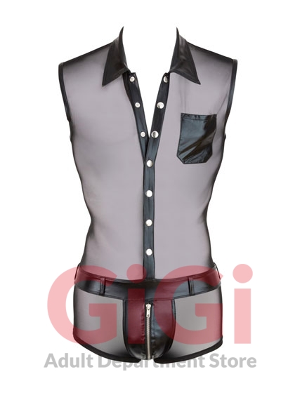 Stretchy soft net with fancy modern wetlook details. The playsuit has a row of buttons down the front that stops at the waistband. The waistband has belt loops. The pouch has an (extremely practical) zip. There is a patch pocket on the chest and two on the buttocks.