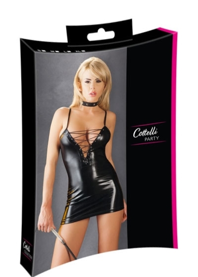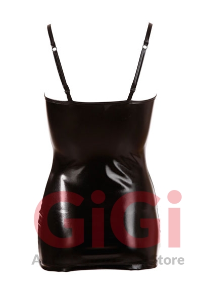 Tight-fitting, shiny wet look dress with provocative eye-catching lacing over the cleavage. With adjustable straps. Black. 92% polyester, 8% spandex.