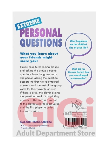 Extreme Personal Question Party Adult Game from Kheper Games. What you learn about your friends might scare you, with this very personal game of questions. Players take turns asking the group questions and the first two volunteers share their answers. The group votes for their favorite answer and that player wins the card as a point. The first player to collect five cards wins. Brace yourself, the questions get hugely personal.