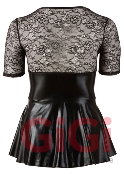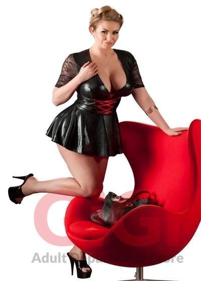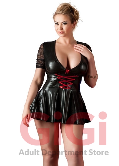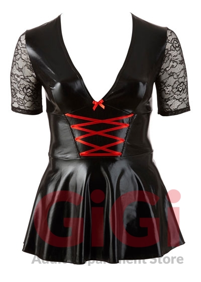 Black mini dress with red lacing over the low-cut cleavage area. With short lace sleeves and flared skirt part. Lace insert at the back. 92% polyester, 8% elastane. Lace: 90% polyamide, 10% elastane.