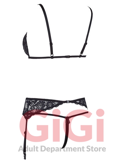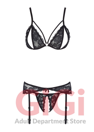 3-piece suspender set with seductive floral lace. The bra has adjustable straps, a captivating strap design in the cleavage area and cups with cheeky slits - accentuated by a small decorative ring. The included suspender belt is narrowly cut and has adjustable suspender straps. Both lingerie pieces have a clip fastener at the back for easy on and off. The completely crotchless string adds the finishing touch to this ensemble.