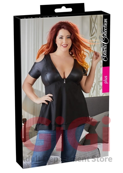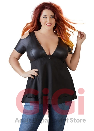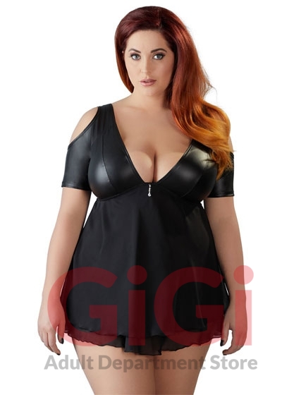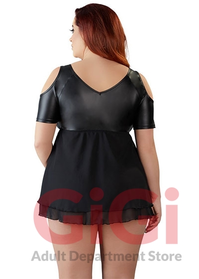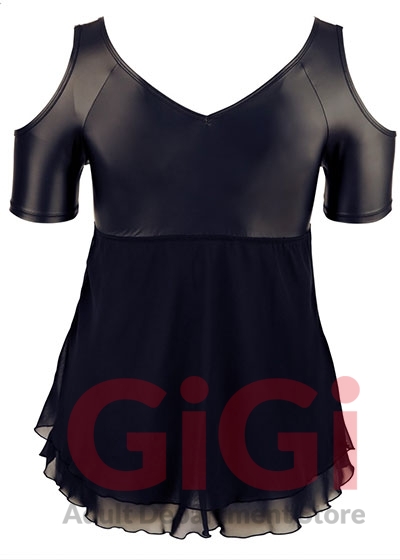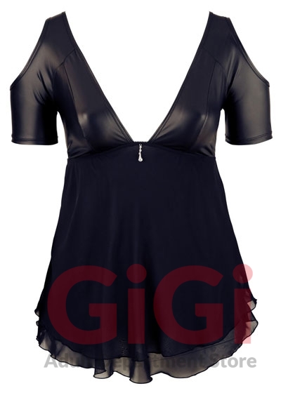 The low-cut, cold shoulder babydoll has rhinestone decoration at the front and short sleeves. The top part is made out of matte material and the bottom part is made out of flared, double-layered chiffon.