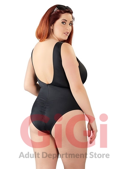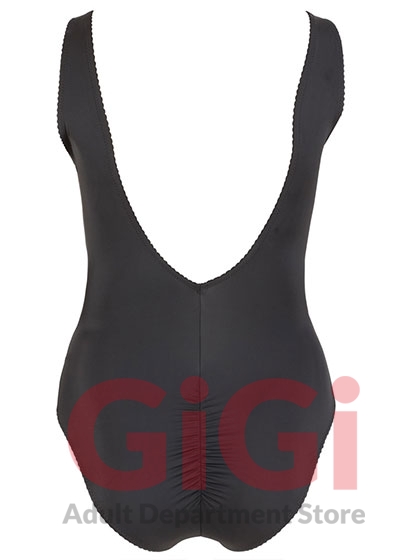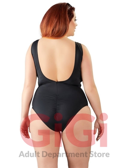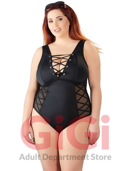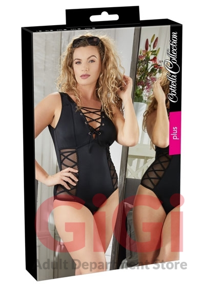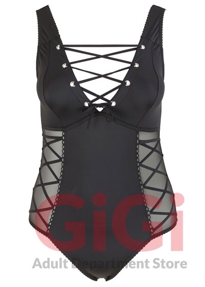 The black body stands out from the rest because of its low-cut cleavage area with eyelets and lacing, and the transparent inserts at either side with decorative lacing over the top. It is also low cut at the back too and there is a ruffled seam over the buttocks as well.