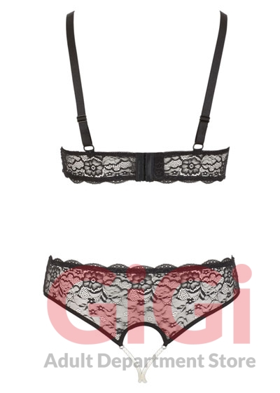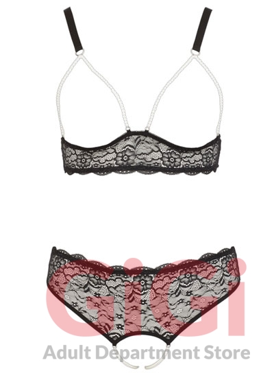 The wireless bra with open cups, a hook-fastener at the back, adjustable straps and pearl chains above the breasts definitely stands out from the rest. The string with 2 pearl chains over the completely open crotch area is also extremely seductive.