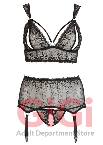 The 3-piece black suspender set is made up of a bra, suspender belt and string. It won’t just be the elaborate embroidery that’ll make you a hot eye-catcher because the wireless bra with its practical hook-fastener at the back will allow your partner cheeky glimpses of what’s underneath – the cups have seductive slits in them. The small ring at the front is a further highlight.