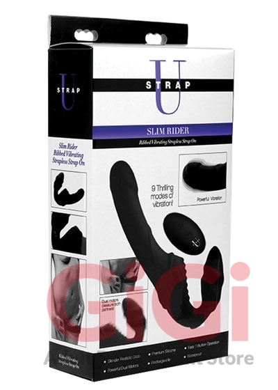 With a push of the button on the remote control, send vibration into the slender shaft and the textured bulb of this double-sided dildo. This rechargeable pleasure tool features dual motors to provide you with 3 speeds and 6 patterns of powerful internal thrumming for both partners. The single control button on the Pro Rider is easy-to-use and accessible during penetration, but a remote control makes it even more convenient and exciting! The silicone remote fits easily and securely in your hand while you immerse yourself in intimacy, granting access to all 9 functions. Both ends of this artfully designed double dong are shaped for the ultimate in ecstasy: the bulb is adorned with gentle waves while you grind your clit against bold grooves of the front pad. Meanwhile your partner will be treated to a narrow, comfortable shaft with a slight ridge. It is even waterproof so that you can take your play into the shower, bath, pool, and more! Explore greater intimacy with a vibrating double-ended strapon dildo. Made of silky silicone, the Slim Rider is non-porous and phthalate-free. Clean with warm water and mild soap or toy cleaner and avoid use with silicone lubricants.