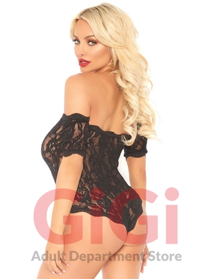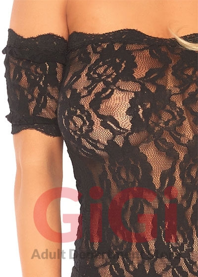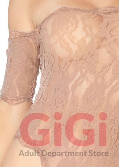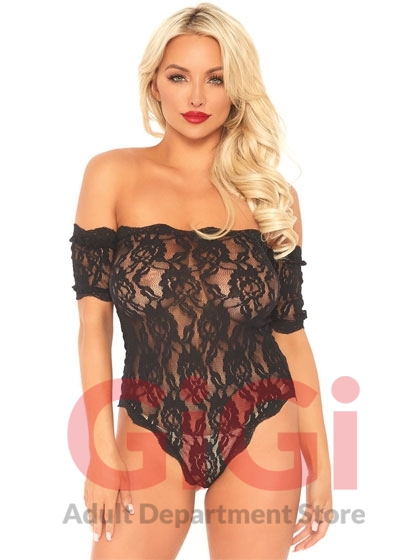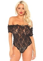 Scalloped rose lace strapless teddy with cuff sleeves and crotchless brazilian bottom.