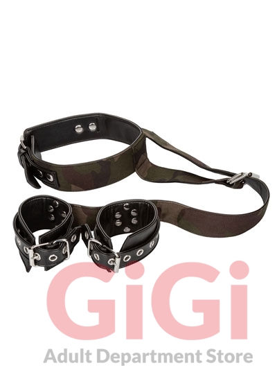 The heavy-duty padded cuffs are made from a durable camo canvas with universal clasps and rings for endlessly creative restraint play. Clasp this heavy duty harness to your collar or other restraint wear for endlessly creative thrills. Detach the camo collar from the durable harness and wear your naughtiest restraint around town or attach the universal clasp from the leash to ties, handcuffs, over the door harnesses or collars for versatile bondage play.