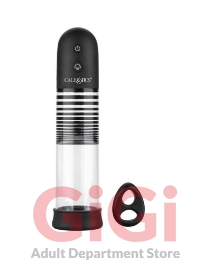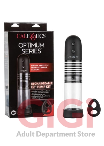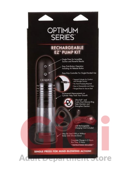 Optimum Series Rechargeable EZ Penis Pump Kit from California Exotic Novelties. Maximize your pleasure tool with the Optimum Series Rechargeable EZ Pump Kit, a sleek automatic pump with Ultra Soft dual silicone ring. Increase endurance, improve stamina and amplify your rod with powerful suction at the touch of a button. The easy pump has easy touch controls and a quick air release button for customized pumping. Enhance your exercise by slipping into the Ultra Soft dual enhancer ring, a super plush silicone cock ring for sensational enhancement. While the thick open-end sleeve and tight, nubbed chamber give you sinful stroking pleasure with or without the pump. Never settle for less when it comes to the size of your pleasure with the Optimum Series.The cylindrical pump and thick, durable sleeve are designed to create the perfect seal and powerful suction at the touch of a button. Once you have reached your peak pump, use the quick air release to decrease suction or release seal. When used regularly, this powerful pumper can increase stamina, enhance overall size and amplify sensation. Recharge the premium pump in 2 hours with the provided USB charging cable to enjoy 3 hours of passionate suction. To track progress, use the incremental measurement marks on the cylinder shaft. The premium sleeve fits into most standard pumps, but can be used independently for a passionate stroking experience. The premium Thermoplastic Rubber TPR is a body safe, unscented and phthalate free to keep you most sensitive spots, happy and healthy. Enjoy easy clean up with this maintenance free stimulator sleeve, simply wash with soap and warm water before and after each use. Use ample lubricant for easy insertion. Specifications Color Black. Materials Silicone, ABS Plastic, Polystyrene. Power source USB Rechargeable, included. Features Phthalate free, Rechargeable. AllergensN/A. 1 year warranty. Maximum run time 180 minutes. Maximum charging time 120 minutes. Measurements 8 inches by 2.25 inches Cylinder. 2.75 inches by 1.25 inches Donut. 2.75 inches by 2 inches overall ring. 1 inch ring diameter. Bulk weight 12.1 ounces. Package 16 ounces. Package 3 inches by 6.5 inches by 13.5 inches.