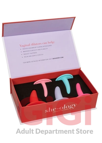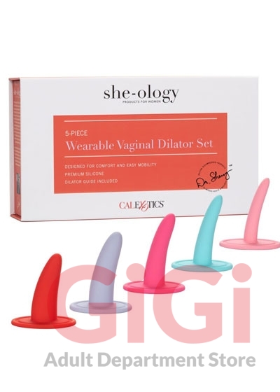 Revitalize and strengthen vaginal muscles with the contoured She-Ology 5-Piece Wearable Vaginal Dilator Set. The uniquely designed 5-piece dilator kits are ergonomically curved and gradually sized to allow for gentle dilation. The premium silicone probes have a curved base for gentle insertion and stimulation, pair with a mini bullet for intensified sensation!