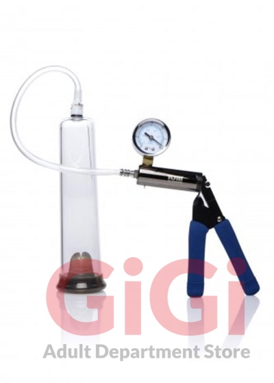 Get rock hard with a heavy-duty pumping system. Achieve an erection as impressive as the iconic drawings of Tom of Finland when you slip your penis into the silicone comfort sleeve of the cylinder, creating a strong seal with a bit of water-based lube if necessary. Snap the hose onto the vacuum lock top of the cylinder and squeeze the comfort grip handles to begin suction. Every squeeze will reflect on the pressure gauge, as well as in your penis as it becomes engorged.
