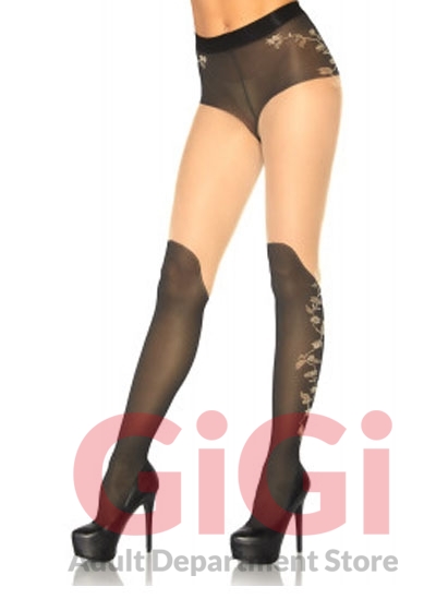 Spandex sheer french cut pantyhose with over the knee boot detail and floral accent.
