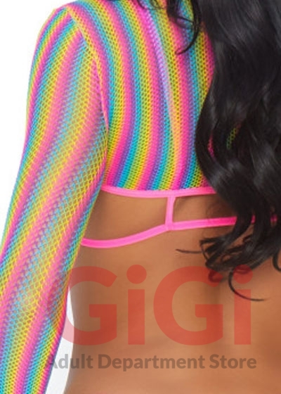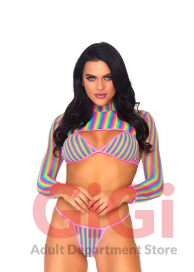 3 PC Rainbow fishnet bikini top, g-string, and long sleeved crop top.
