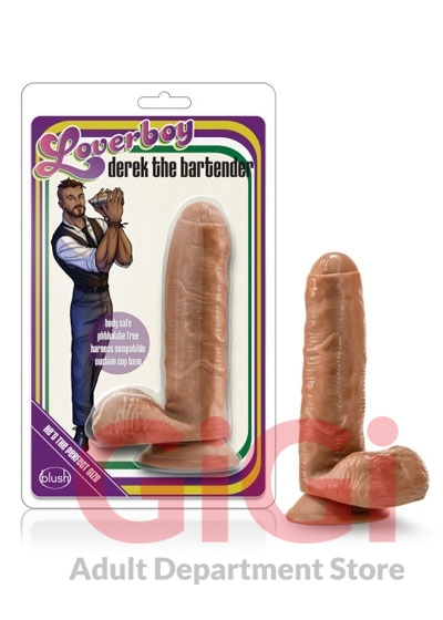 Derek the Bartender is ready to mix your drink just the way you like it! Call him over and order whatever you have in mind...then take him home with you to feel all his lifelike detail. Featuring realistic skin texture, including an uncut foreskin, Derek listens to your order and then delivers. With 5.5 inches insertable length and 1.75 inches girth, Derek is a comfortable average size that won't leave your head spinning. Made of phthalate-free, non-porous PVC, this dildo features a suction cup base that sticks to any smooth, flat surface and is harness compatible.
