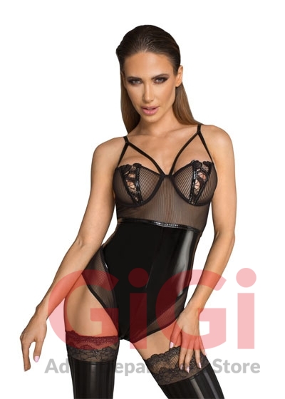 Extravagant body with embroidered underwired cups, a high leg cut and a 2-way zip over the crotch as well as another zip at the back. Made out of semitransparent, striped net material that is combined with shiny vinyl. It also has decorative straps in the cleavage area and decorative vinyl stripes.