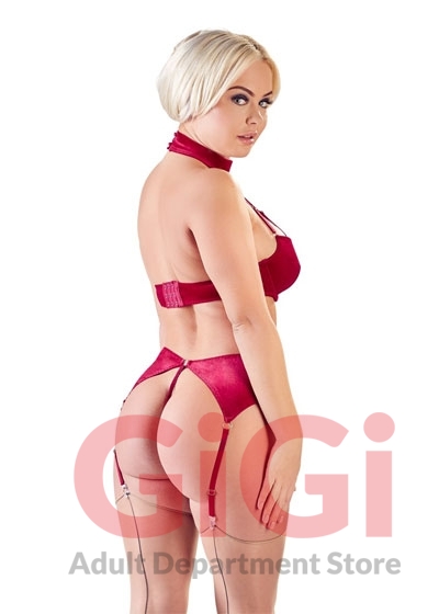 3-piece suspender set made up of an underwired bra, suspender belt and string. All pieces are made out of red velvet with gold-coloured metal details. The underwired bra is slightly padded. It has 5 fancy cleavage straps that go up to a choker with button fastener and can be adjusted for a comfortable fit. The suspender belt has a clasp at the front and 4 adjustable suspender straps.