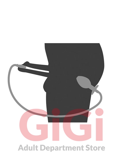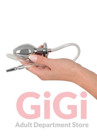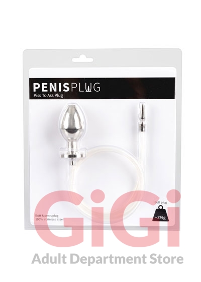 The hollow, heavy anal plug is connected to the open penis plug with a tube. Includes a black replacement tube.