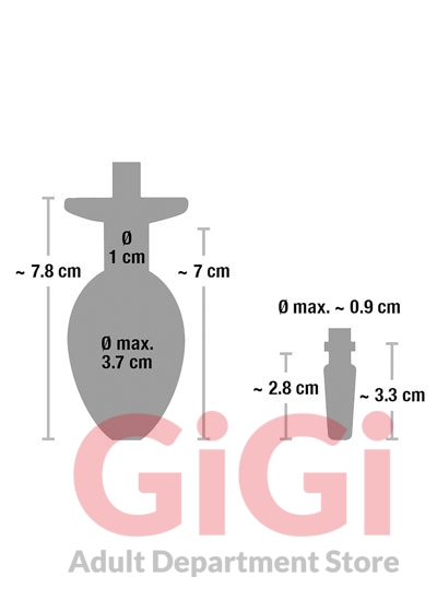 Anal plug: complete length 7.8 cm, Ø max 3.7 cm, weight 374 g; penis plug: complete length 3.3 cm, Ø max 0.9 cm; length tubes 62 cm.