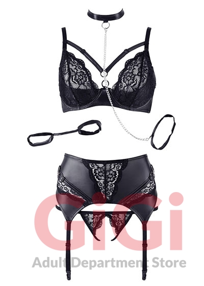 This 3-piece suspender set combines beautiful matte look and delicate floral lace. The elaborately designed underwired bra has an eye-catching design with adjustable straps and decorative rings in the cleavage area. The lace cups can be folded down to only leave a slightly padded shelf bra. The included suspender belt has adjustable suspender straps and a captivating front with silver-coloured rings and lace inserts. Also includes a crotchless string with 2 straps that perfectly highlight the crotch area, handcuffs (hook and loop fastener) with a short connection strap, a collar (hook and loop fastener) and a leash.
