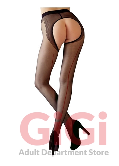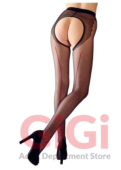 Excitingly open crotch - airy and perfect for spontaneous sex. With reinforced toes and panty part. Red decorative seam down the legs. Black. 79% polyamide, 20% spandex, 1% polypropylene.