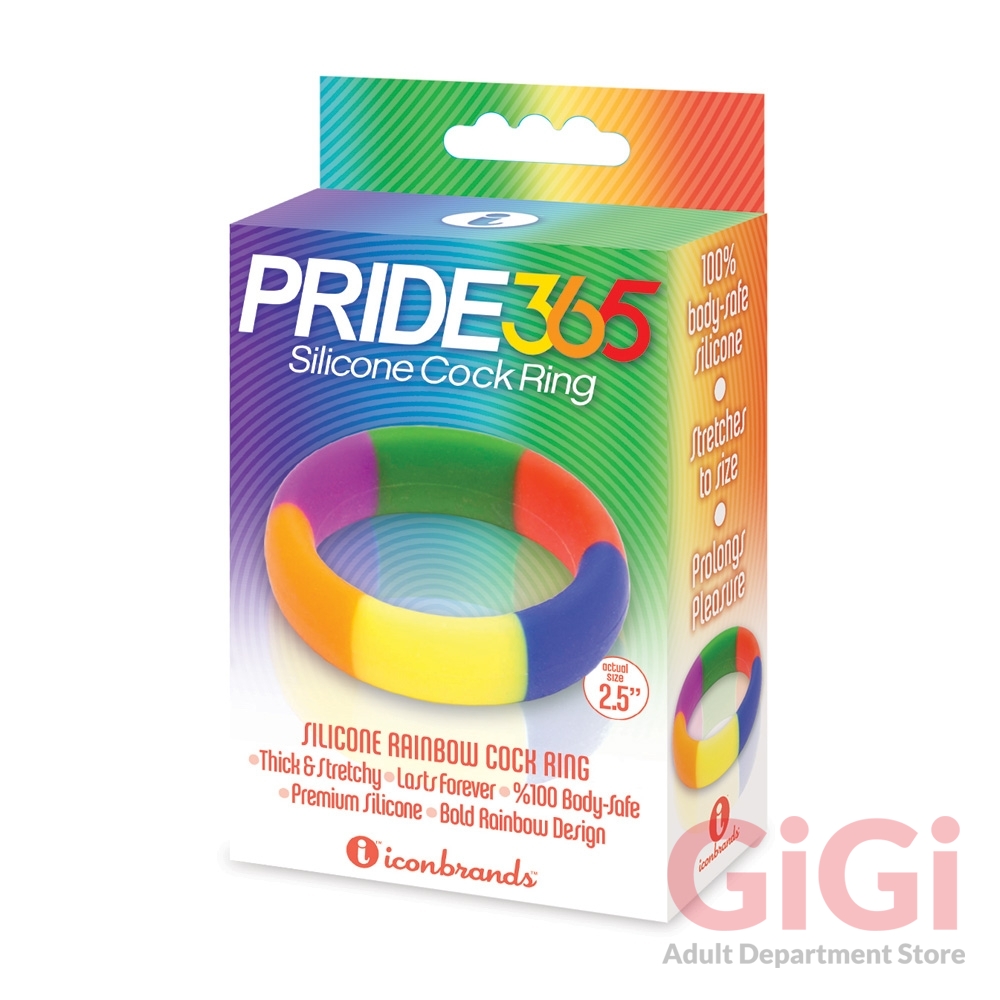 Show your pride with this premium silicone cock ring in LGBT flag colors. Pride 365 Silicone Cock Ring is thick & stretchy with a silky finish. Made of 100% Body Safe Premium Silicone in Proud Rainbow Design. Prolong your erection and project that hard-on with pride! Icon presents the Pride365 cock-ring, made with medical-grade silicone, the finest material known to novelties!