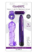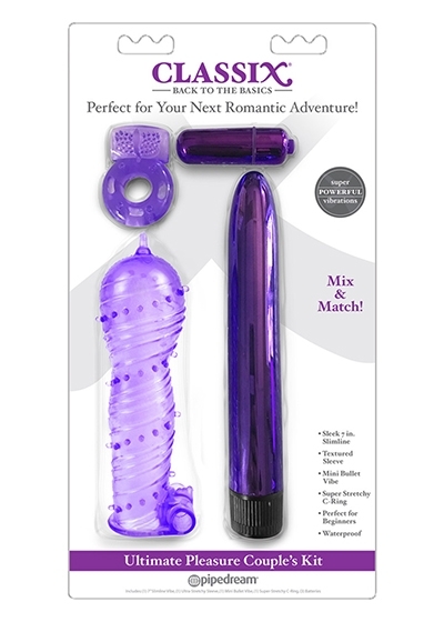 Enjoy exciting variety and endless versatility with the ultimate couple's kit! All four classic favorites can be used together or separately. The slimline 7” multi-speed vibe can be paired with the ultra-stretchy textured sleeve and powerful bullet for your own super-stimulating rabbit. Try placing the C-ring around his shaft or balls, with or without the vibrating bullet, for thrilling sex play. The possibilities are endless for hours of sexy partner play!