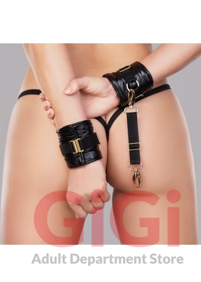 Wide butter soft ruched faux leather wrist cuffs with adjustable elastic satin trim wrapping around its centre. Polished gold finish accents add bling to these naughty with style cuffs. They come with a garter inspired connector strap, with chunky gold lobster clasps on either end.