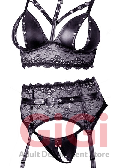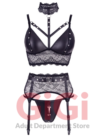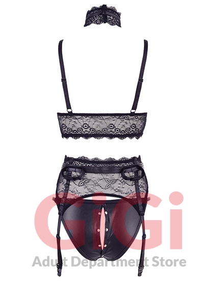 Beautiful bralette with removable cups (can be unbuttoned), adjustable straps in the cleavage area and a choker. The matching suspender belt has an eye-catching design with a strap that has a decorative ring at the front. It also offers adjustable suspender straps and removable handcuffs with hook and loop fasteners at the back. Briefs with press studs that go over the crotch and stop at the top of the buttocks. Made out of floral lace in combination with trendy matte look and studs.