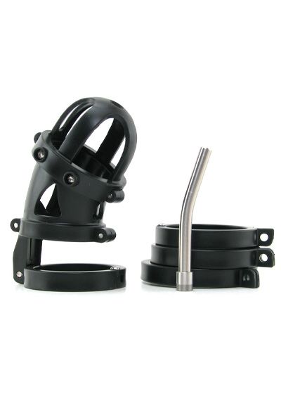 The Captive has a opening at the front for urine and otherwise, so it's suited for long term wear, if desired. Speaking of long term wear, a stainless steel urethral spout is also included, it can be secured to the front end of the cage through a threaded entry. While worn through the head of the penis, the spout allows urine and otherwise to pass through.