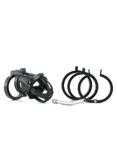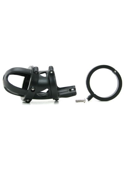 Once you're ready to truss up your playmate and you have the simple components spread out, you'll first notice the sleek, firm, cage in a glossy black plastic. It's shaped to comfortably (but very securely) contain the penis, preventing him from touching, rubbing and otherwise interfering with the imposed chastity. The cage itself is about 2 1/2 inches in length fitting most natural state penises- it's meant to fully surround the head and most of the shaft. Attaching to one of four available sleek, firm cock and ball rings via simple screws, the fit can be fully customized thanks to 1.6 inches (38mm), 1 3/4 inches (45mm), 1.875 inches (48mm) and 2 inches (51mm) respectively. The rings open up for an easy-on, and screw shut with the included screw and a flat head screwdriver (not included).