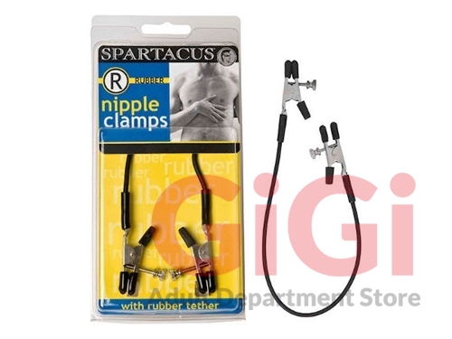 Sleek and slick rubber is a delight to wear. These Spartacus nipple clamps are tipped with rubber for your comfort. A smooth rubber tether completes the look.