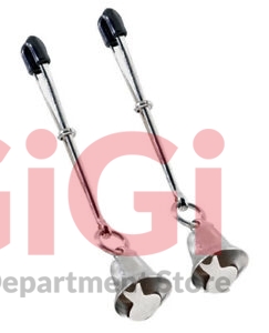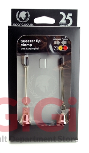 Adjustable tweezer-style nipple clamps with tiny bells and soft rubber tips. The small silver bells ring when they move. Adjust the clamps by sliding the metal metal rings up the tweezers - from merely lovely decoration to pretty strong st imulation.