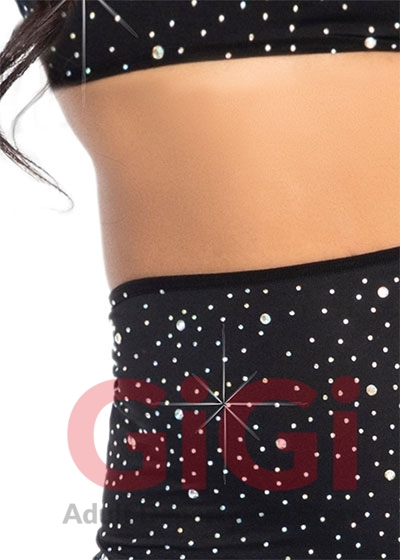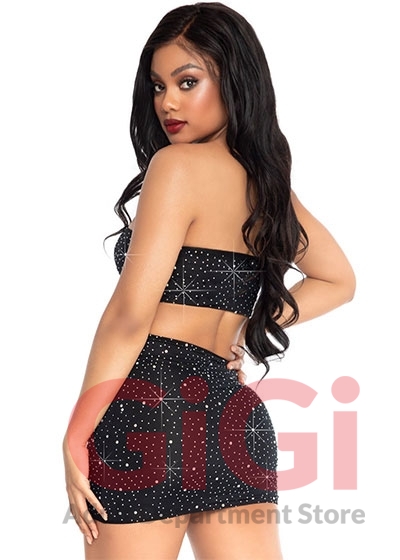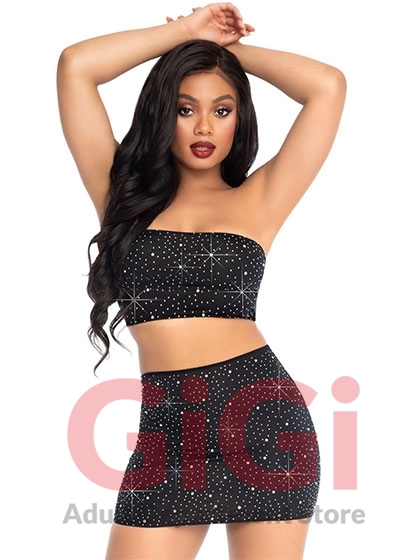 2 PC Spandex opaque rhinestone bandeau and matching mini skirt.