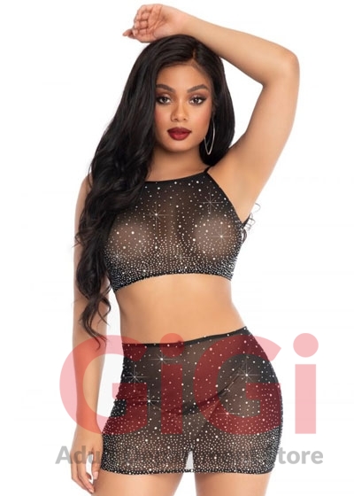 2 PC Spandex sheer rhinestone open back crop top and matching mini skirt.