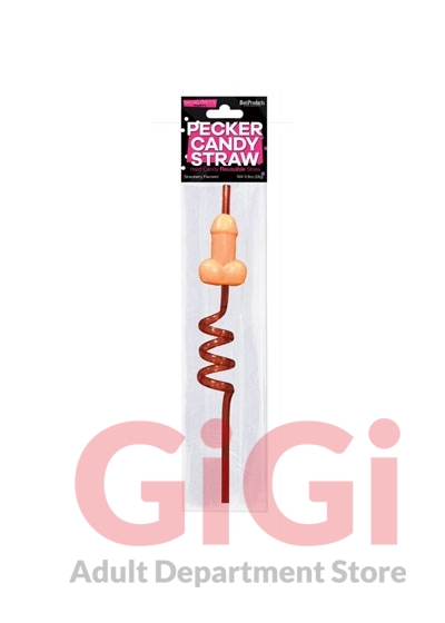 Swizzle straw with a strawberry flavored hard pecker Lollipop.