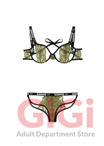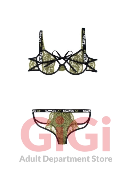 Stretch Lace Cutout Bra with "Savage AF" Elastic Straps and Matching Panty