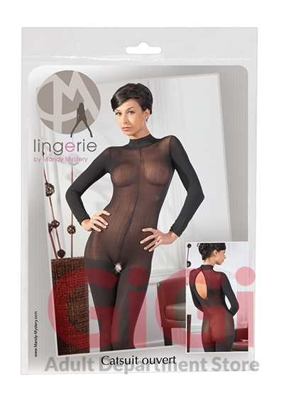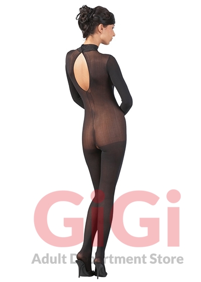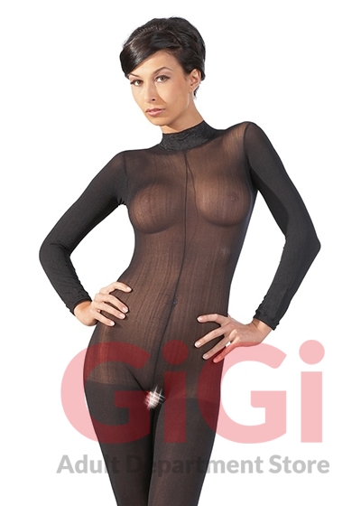 Long-sleeved catsuit made of semi-transparent power net fabric. Crotchless and with a lace collar. With foot part. Soft and light. 100% polyamide.