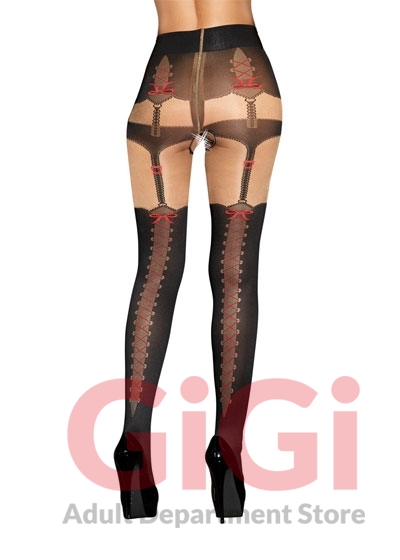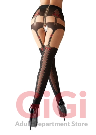Velvety soft tights with integrated panties, suspender stores and stocking part. The tights are invitingly open in the crotch area and have a fancy lacing pattern as well.
