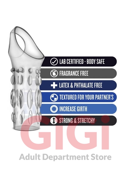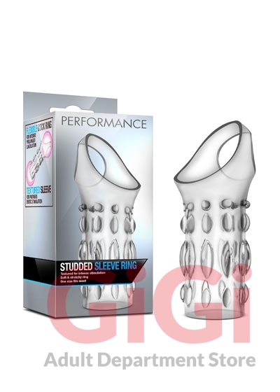 Make your rod into the ultimate sex toy with the Performance Studded Sleeve Ring ! The cock sleeve with attached strap for your nut sack will surround your throbbing manhood to make it even thicker and studded, while the strap keeps the sleeve securely strapped to your rod. ! Show your partner the ultimate time with our Performance Studded Sleeve Ring! This toy is made of TPE; fragrance free, body safe, and easy to clean! Just wash with warm soap and water, or your favorite toy cleaner, before and after every use. Pat dry with a soft towel before storing.