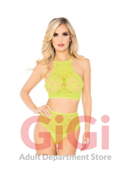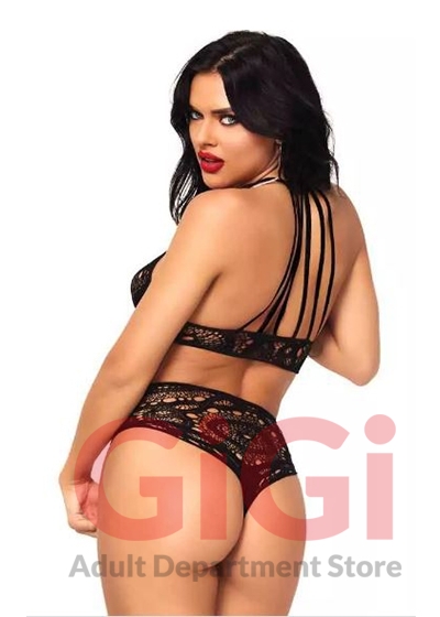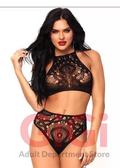 2 PC Crochet lace crop top with strappy back detail and matching high waist thong panties.